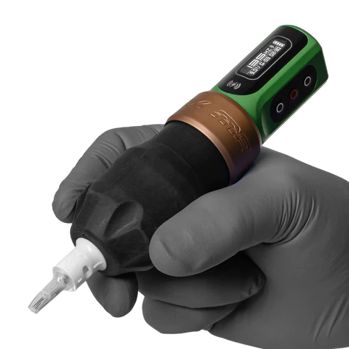 Tattooing using a hygienic, cross-contamination-free setup with disposable FK Irons rubber grips, made exclusively for your EXO machine. These rubber grips can be easily discarded and replaced in case of ink or fluid leakage between clients.