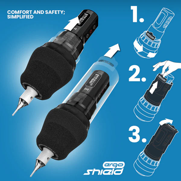Le grip ErgoShield est doté d'une barrière parfaitement intégrée, enveloppant toute votre machine à tatouer, garantissant une hygiène et une sécurité sans compromis. Dites adieu aux processus fastidieux et fastidieux impliquant des sacs à cordon, des serviettes en papier, du ruban adhésif en tissu ou des solutions de fortune. La procédure est simple : sortez l'ErgoShield de son emballage blister stérile, remplacez votre grip d'origine par celui-ci et, lorsque les fils s'engagent, déployez la barrière intégrée en tirant sur la languette autocollante. Une fois entièrement déployée, scellez et verrouillez l'extrémité de la barrière en décollant la languette autocollante. C'est aussi simple que ça !